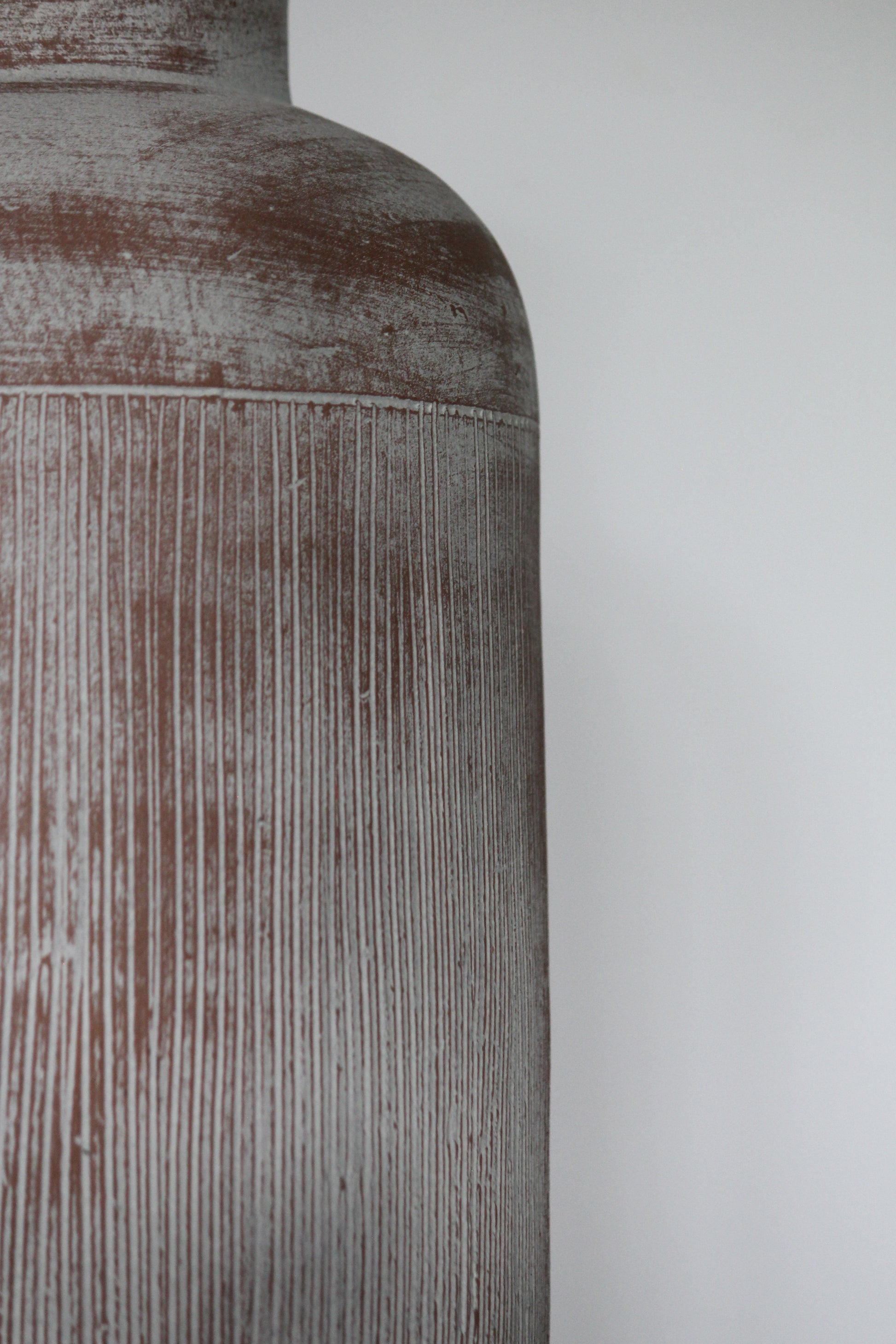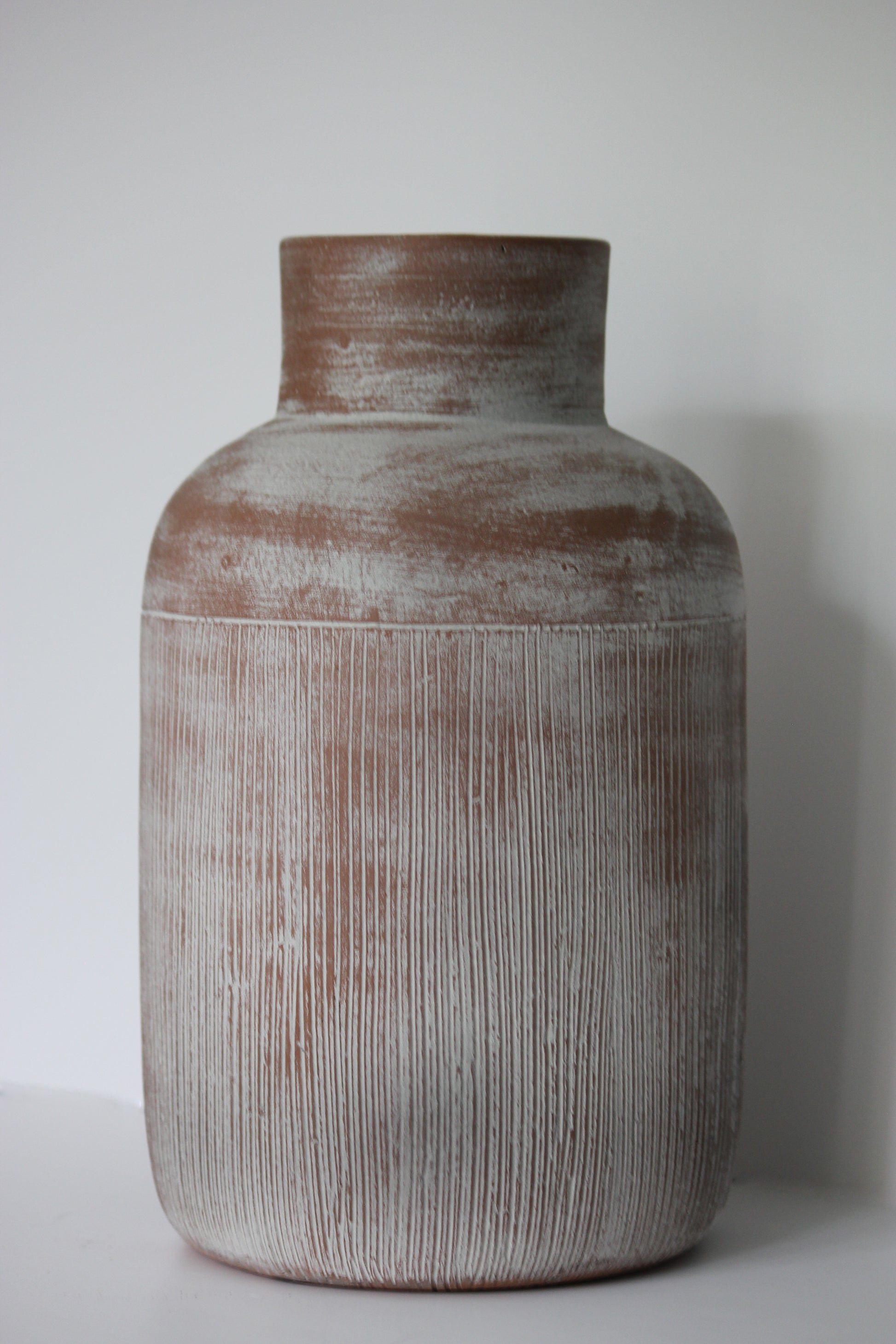 The Classic '09 pot is ideal as a centerpiece for a table or as an accent piece at the entrance of your home. Inspired by the warmth of natural earth tones, it features a timeless shape with a terracotta shade and a chalky white finish, along with fine, straight-line engravings. This pot brings the rich, earthy feel of the outdoors inside, making any space feel grounded and connected to nature.